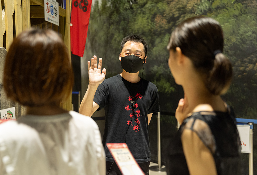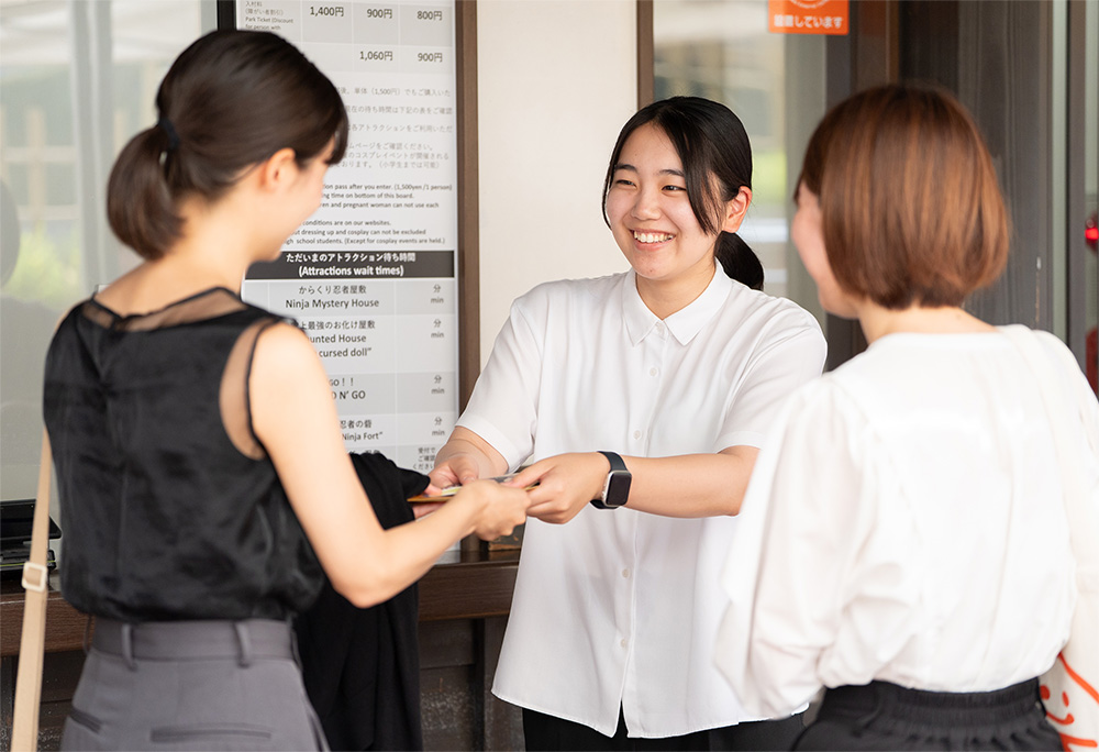 - 映画村のアトラクションは、忍者や時代劇の世界観を感じられます。好きな世界観の中で、お客様と一緒に楽しめるポジションです。